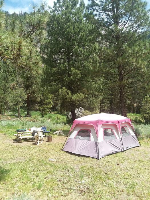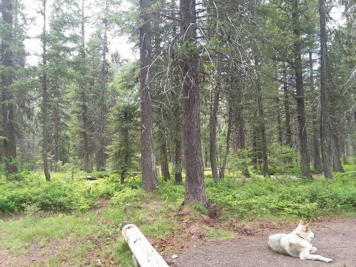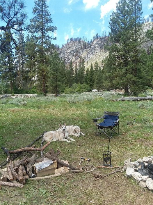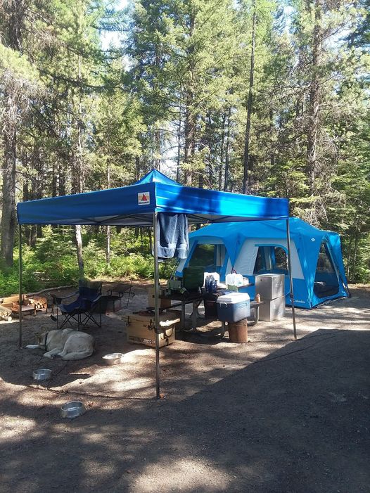 It was starting to cloud up when we headed for Orofino to get some food. We picked up a few things then headed back to camp. The first thing was to get the tent set up and to begin to organize camp. While I was getting our camp ready, the boys were resting from our long day driving. They found a nice area on the grass, and under a pine tree to settle in for a nap. They settled in nicely to their new environment. I was also able to set up the canopy for cover from the rain.